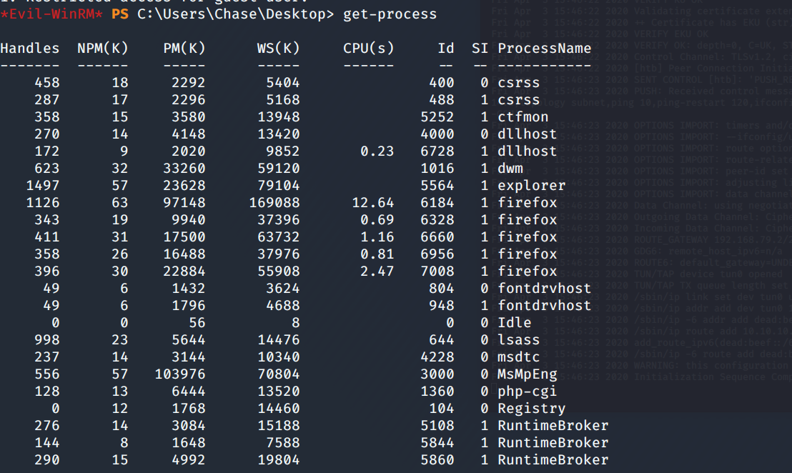 We type out the todo.txt file in Chase's Desktop folder and we see that his #1 item is to constantly check that issues page.  Running Get-Process shows that he is using Firefox to check that site.  Let's see if we can dump the memory of those Firefox processes in case they have goodies.  To do that, we need the smbserver.py script again.