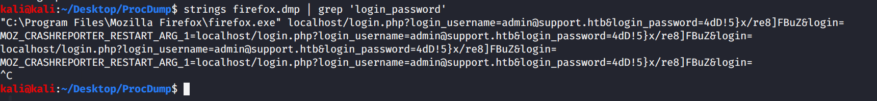 If we intercept a login request to the page, we see that login_username and login_password are the variables that the page is looking for to authenticate. So, we can use "strings" to search the dmp file for login_password and we get this response.