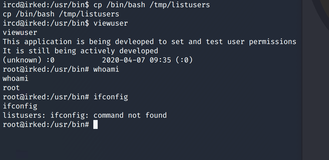 ircd@irked:/usr/bin$ cp /bin/bash /tmp/listusers