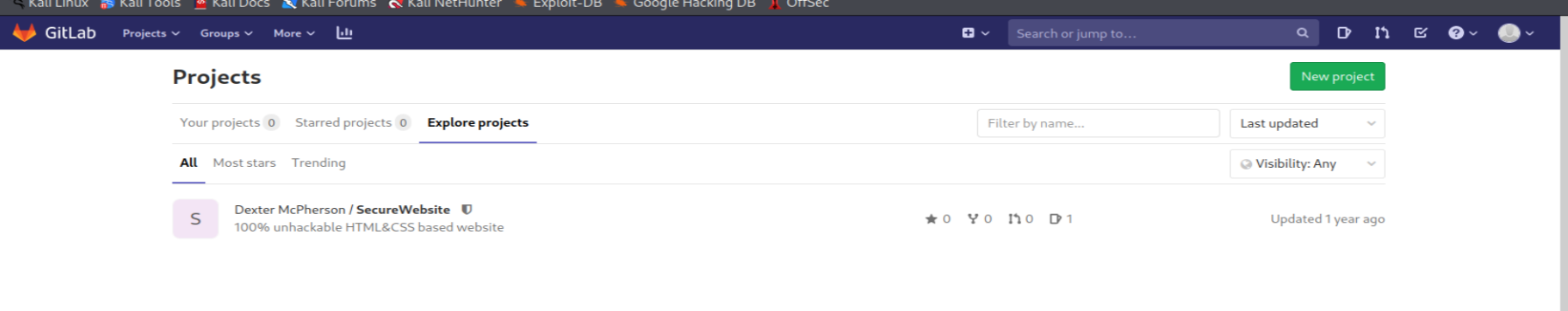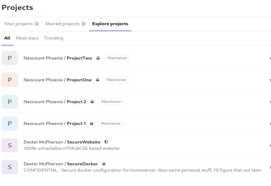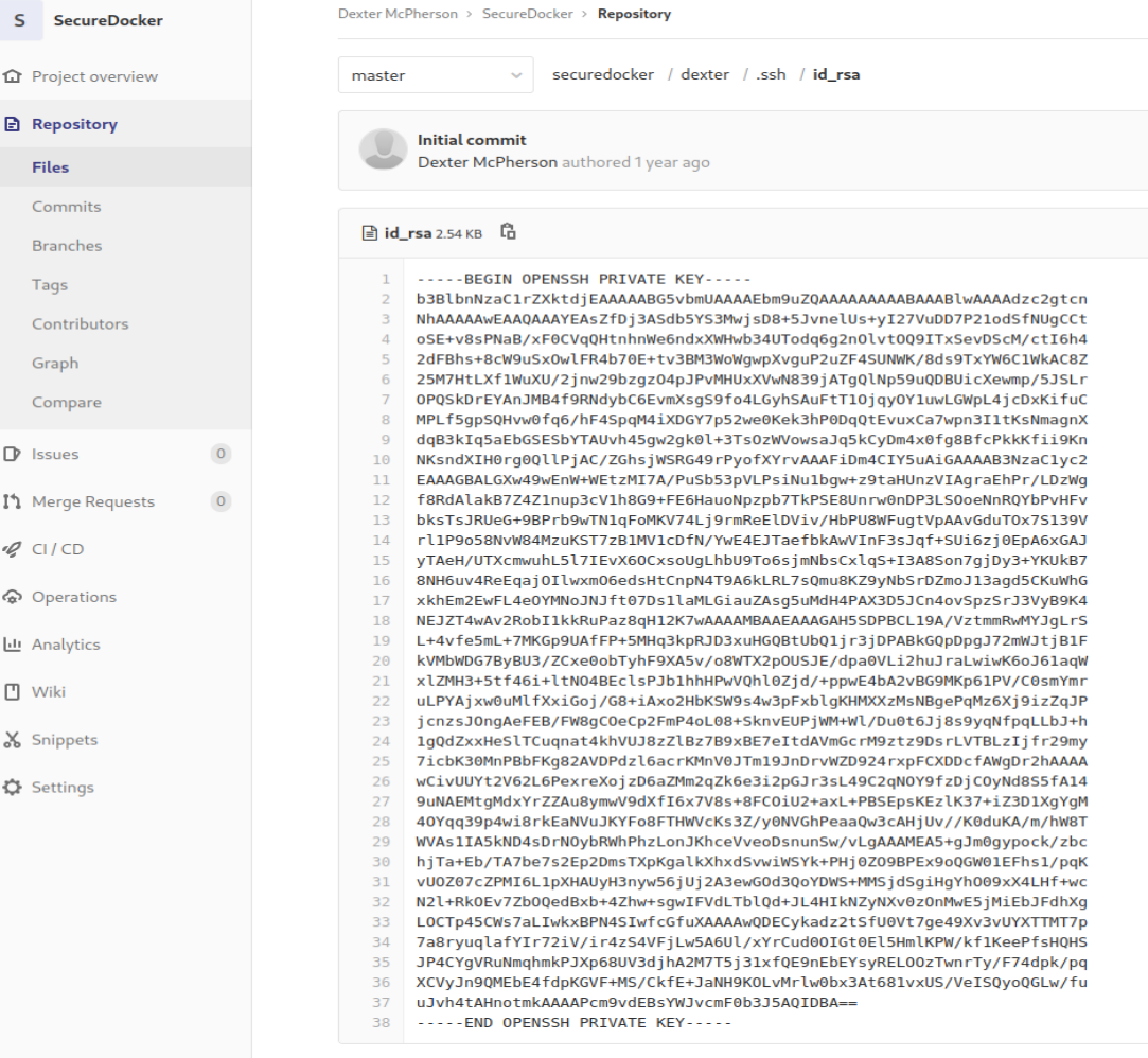 Notice when you refresh the GitLab page, you'll now see a SecureDocker Project from our friend Dexter! Open it and navigate through and you'll find his private key.