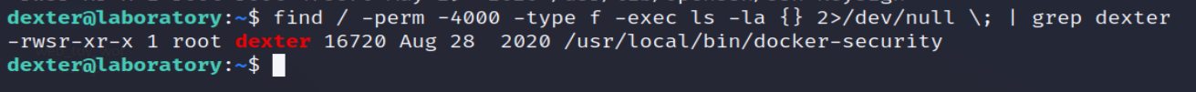 find / -perm -4000 -type f -exec ls -la {} 2>/dev/null \; | grep dexter