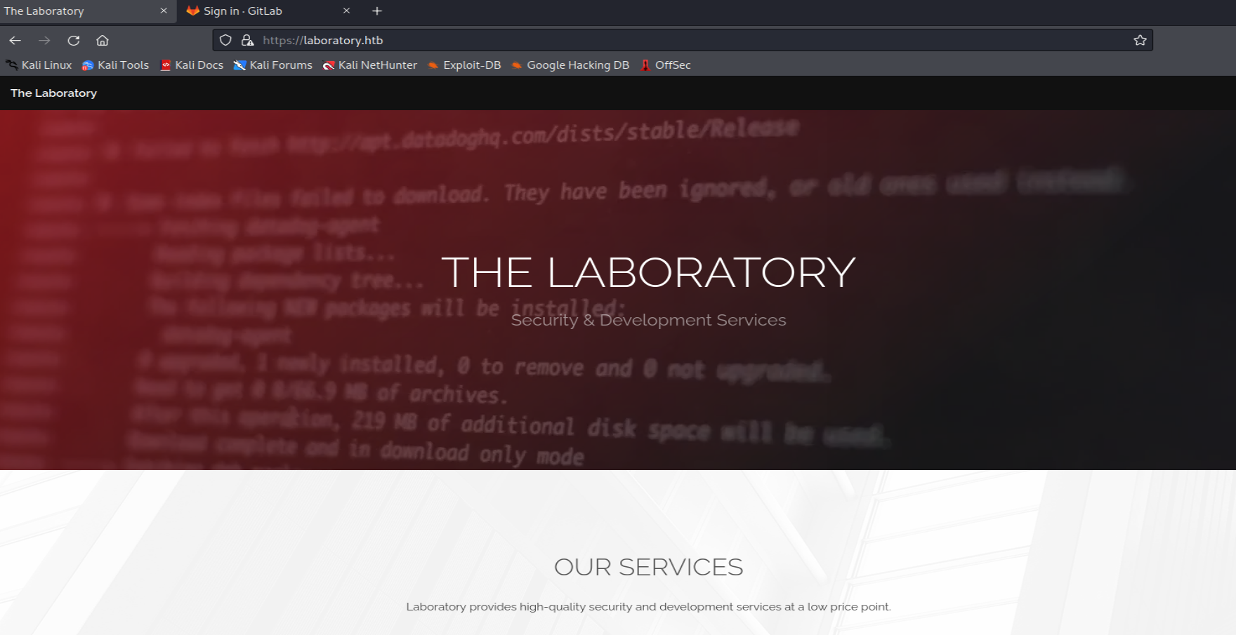 So much for finding interesting files and directories.... Let's navigate to laboratory.htb and git.laboratory.htb and see what we're dealing with.