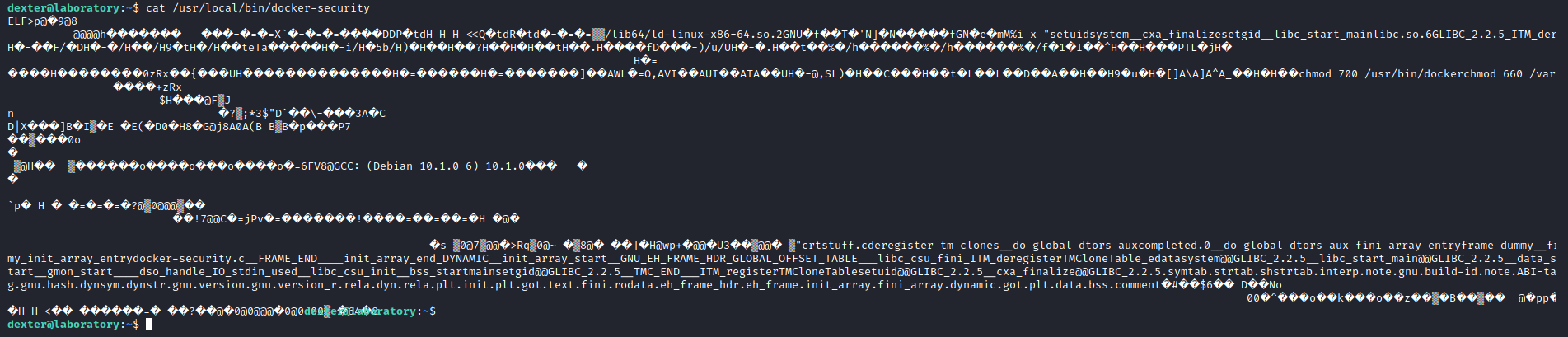 docker-security is the only binary owned by dexter. One of the things that it does is run a chmod. We can easily hijack that by creating our own chmod, adding it to the PATH and running that docker-security binary.