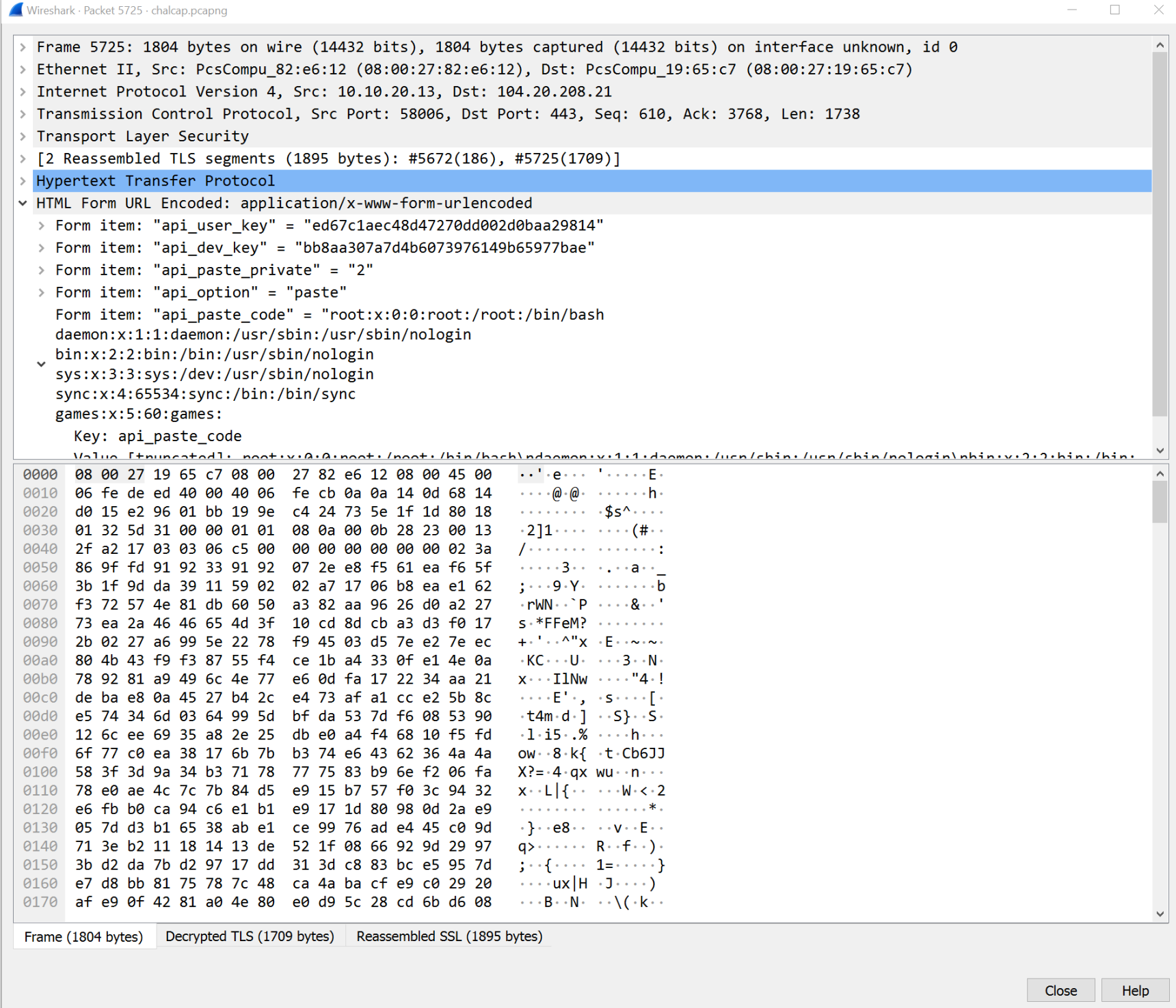 From here, we lose track of everything because most of the traffic is SSL encrypted. Well, here's where that bundle.pem file comes in. If you look grab the pre-shared master key from the key exchange log file (secrets.log) and pair it with bundle.pem in Wireshark and you can decrypt the TLS traffic. To do this, in Wireshark, go to Edit, Preferences, Protocols, TLS (or SSL if your Wireshark has it 3.2.1 only has TLS). In that window, add the bundle.pem file to the RSA key list and add the secrets.log to the Pre-Shared Master Key log field. Once you do this, you can run the Analyze Conversations feature and filter to only TLS (the pcap has it as TLSv1.2). To make sure it works, find the first packet after the first TLS Server Hello (number 5666) and you should see a Decrypted TLS tab. Keep going down. You can actually pull the /etc/passwd file contents from 5725, that helps! We can see from 5725 that POST /api/api_post.php is what threw out the passwd file