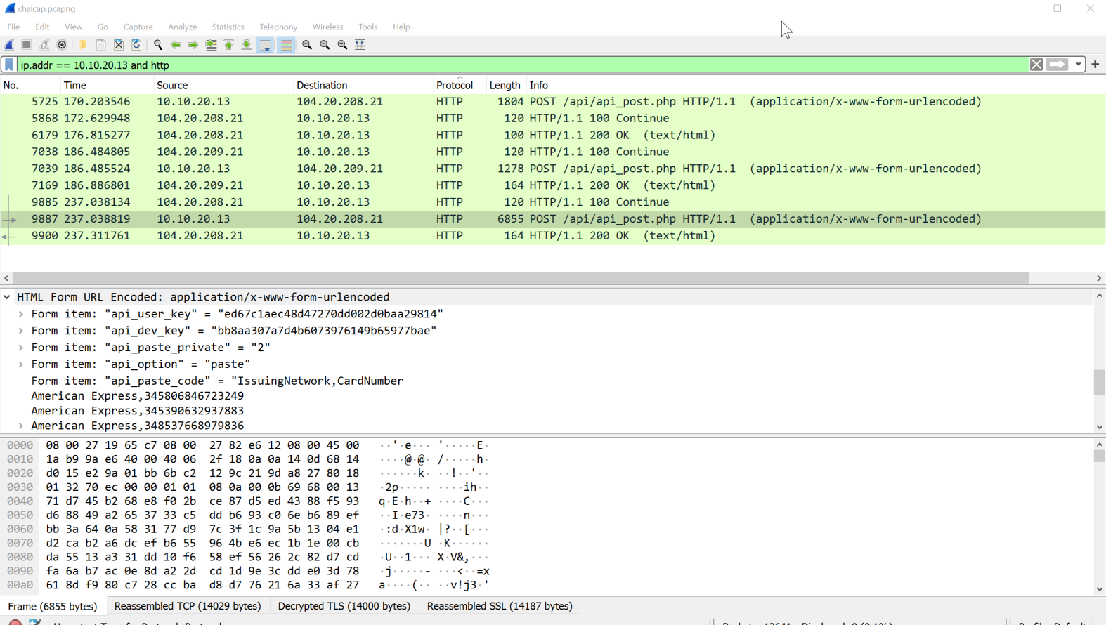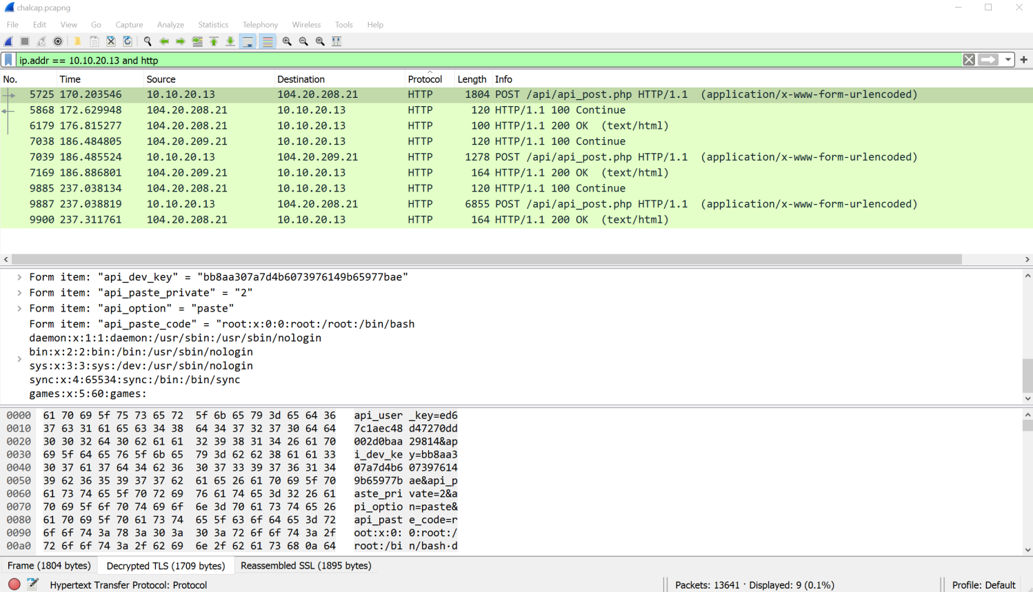Let's put all that together.  If we filter by IP and HTTP, we get 9 results. Only 3 of those are /api/api_post.php and we already know that Frame 5725 is the /etc/passwd file.