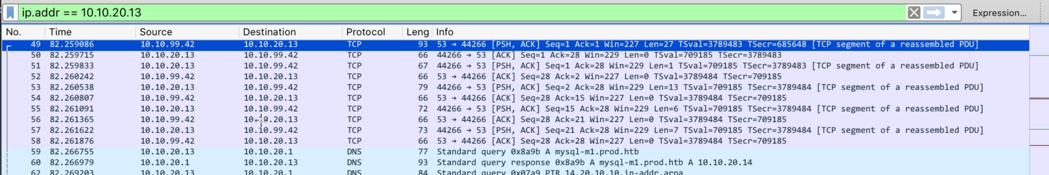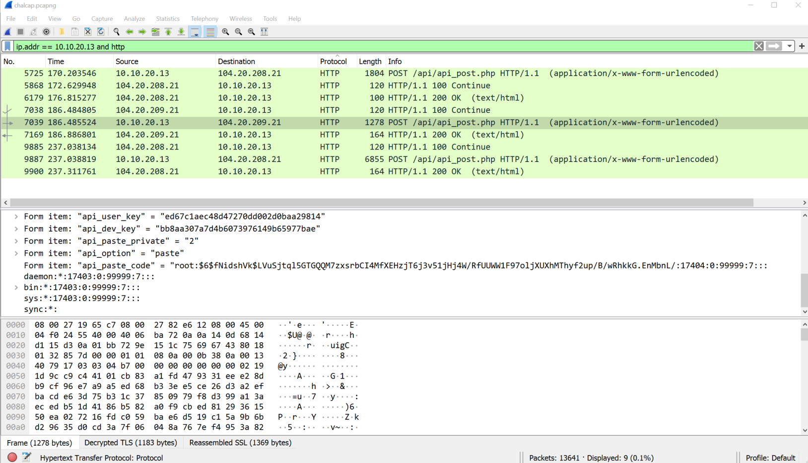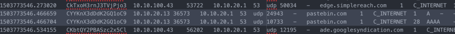 Pastebin connections between 10.10.20.13 and 10.10.20.1. A .1 is usually a gateway so this pretty much narrows down that the attacker's IP is 10.10.20.13. Now we have a search vector inside the pcap. Filtering down to that IP address and following the trail, we see some traffic between 10.10.20.13, 10.10.99.42, and DNS queries to 10.10.20.1 and that it looks like the /etc/passwd file was dumped onto pastebin.