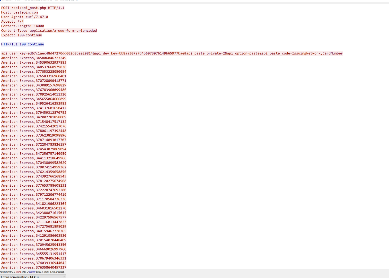 Lastly, we hit Frame 9887. That on has a whole lot of BAD. We see American Express,################'s. If we follow the TLS stream (right-click > Follow > TLS Stream), we get the full output.