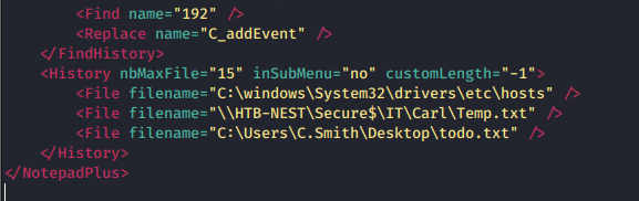 We now know there is a share in IT name Carl.  We know this from \\HTB-NEST\Secure$\IT\Carl\Temp.txt at the end of that