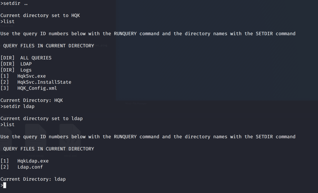 the directory to HQK, list to find out what's there, setdir ldap to move into the LDAP folder.  Aaannndddd screenshot.