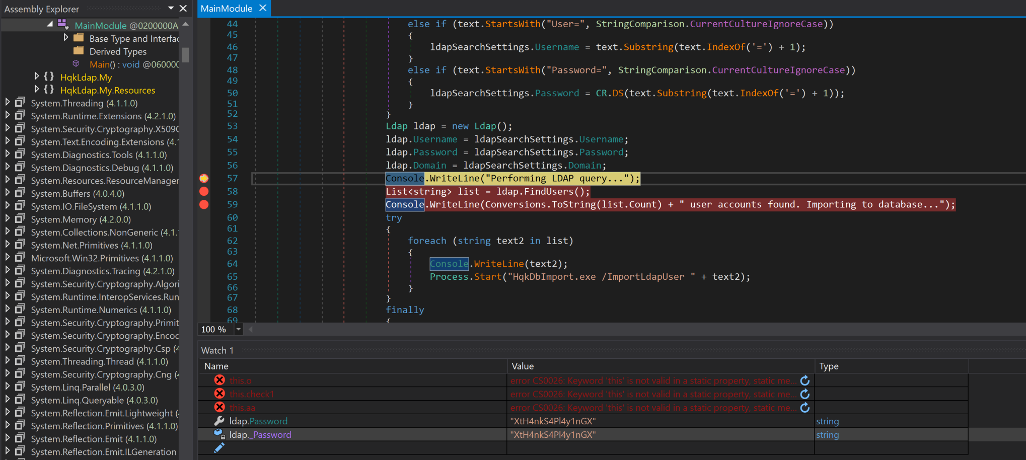 your favorite debugger.  I used DNSpy.  Set a breakpoint in the Main module that breaks it at the Console.WriteLine statement.  Set a Watch condition on ldap.Password.  Run it until it hits the breakpoint and check your watch condition.  If we've done it correctly, ldap.Password should equal "XtH4nkS4Pl4y1nGX".