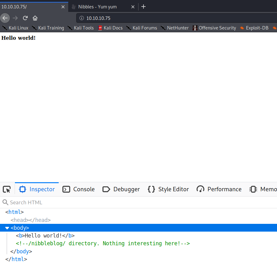 Let's start with the HTTP side of life. The starting page is just a "Hello World" plaintext, but the source code shows us that there is something at /nibbleblog.