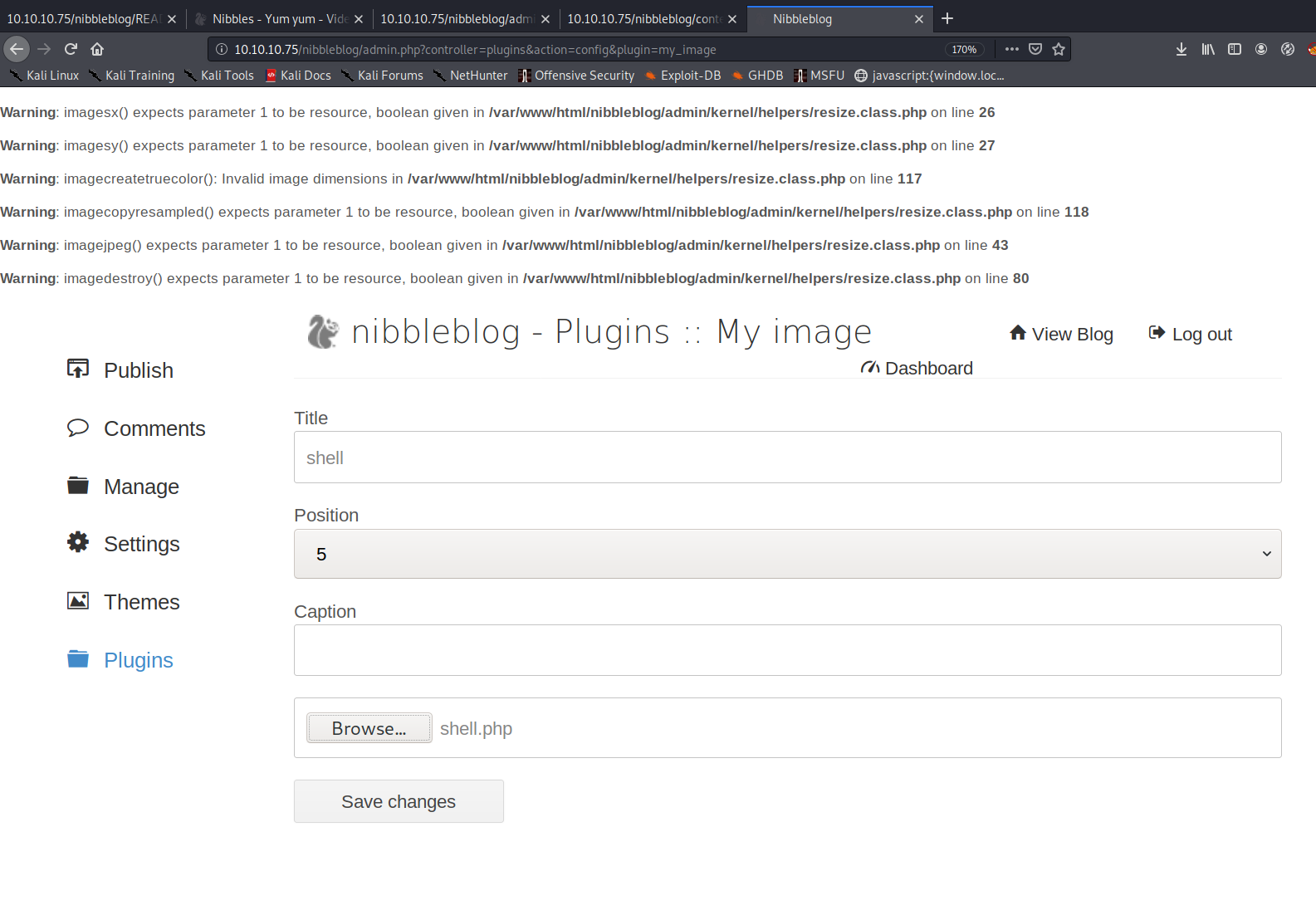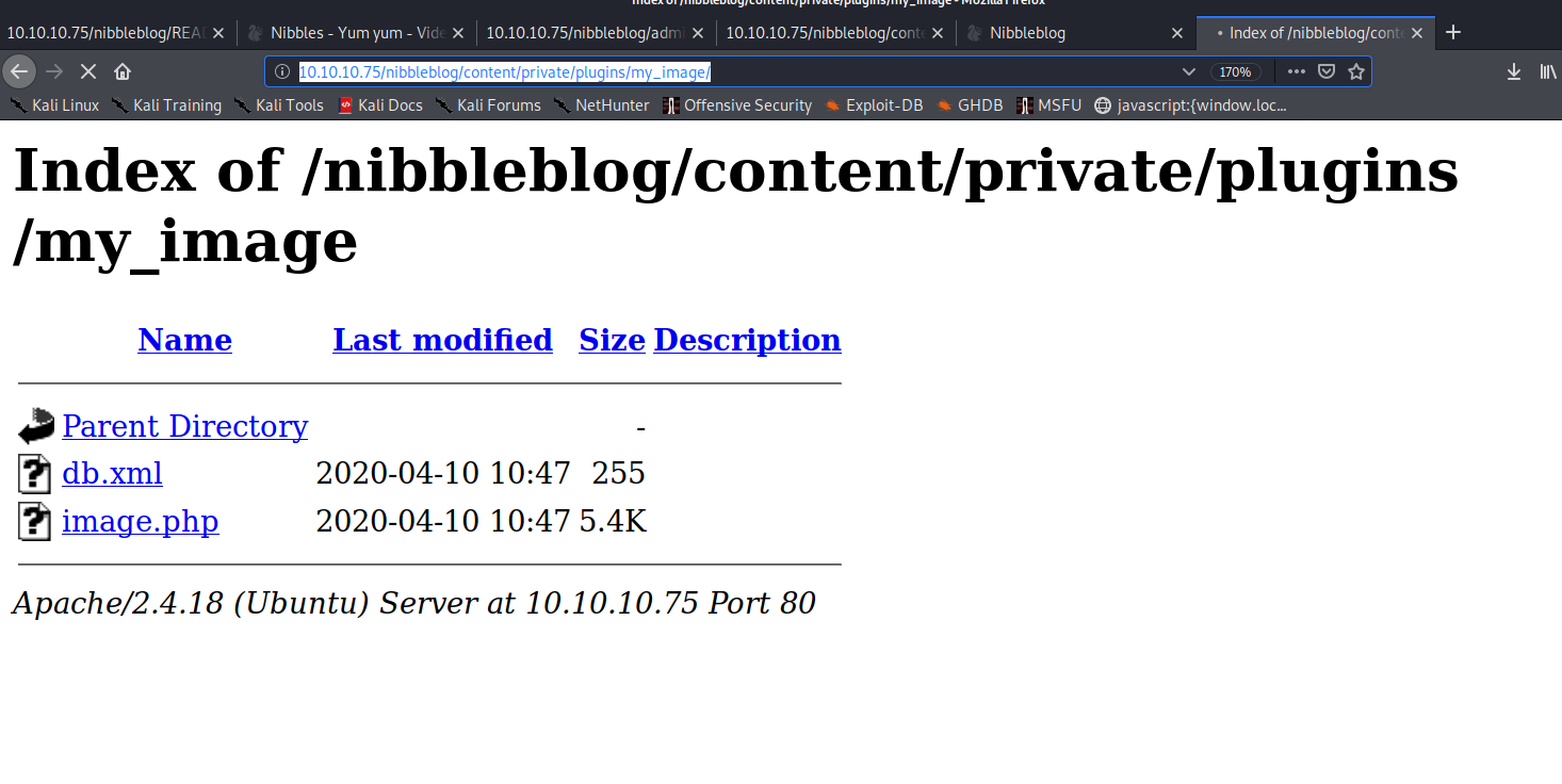 Now, we start a netcat listener (nc -lvnp 1234) and navigate to http://10.10.10.75/nibbleblog/content/private/plugins/my_image/ We don't see a shell.php, but we do see an image.php. When we hit that one, we get a shell as nibbler.