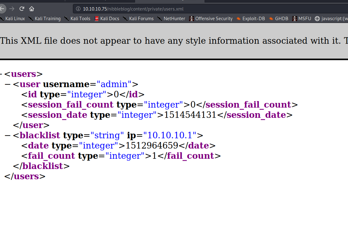 We found a few directories to look through. If we gobuster the /content folder we also find a /content/private. Inside of that folder we find a users.xml. Now we have a username of admin! We also see that a login blacklist is in effect. So, we can't just hammer away at the login page (/nibbleblog/admin.php). To be honest, getting in was a guess. We are dealing with a Nibble Blog and the title is Nibbles. So, try admin:nibbles.