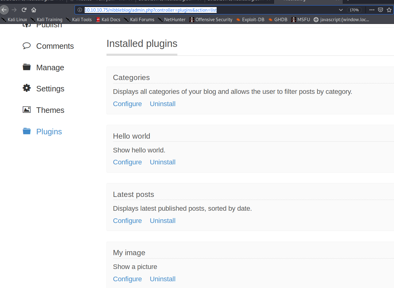 Again, I dislike metasploit (it makes us lazy. Plus, you can't use it on OSCP), so let's see if there's another way to get the same results. We find that "other way" here. When we navigate to the Plugins page, we find that the "My image" plugin is already installed. We just need to configure it.