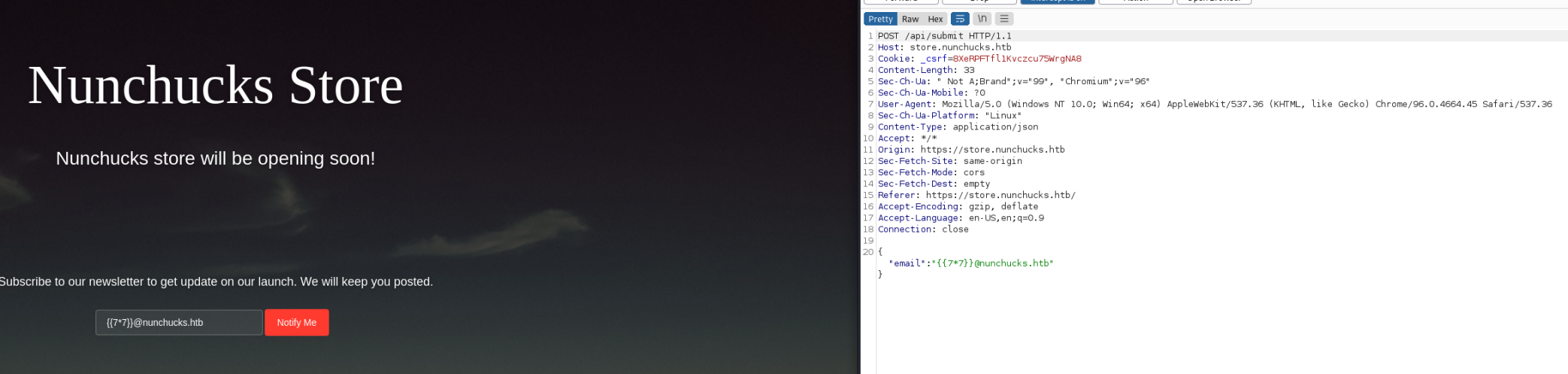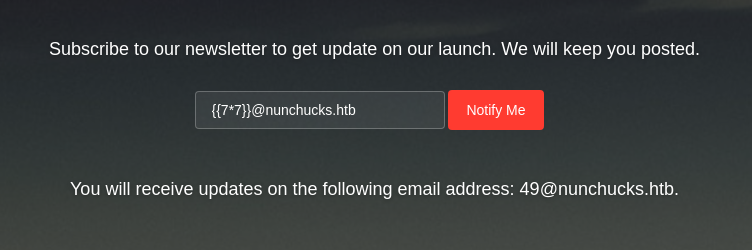 There's no store yet, but a method to sign up for a newsletter. Depending on input validation on this site (and a myriad of other things), we can try different Web App Attack methods. One of those methods is an Server-Side Template Injection (SSTI) attack. To check for this type of attack, we need to input something that uses 7 * 7 = 49 in it. For more SSTI detection methods, check out HackTricks here. Our email address to enter should be {{7*7}}@nunchicks.htb and then capture the response in Burpsuite to confirm the SSTI. In this particular case, we don't "need" to use Burpsuite because the response shows the email address on the page itself to be [email protected], but it's good practice to use Burp in case the address doesn't show on the response page.