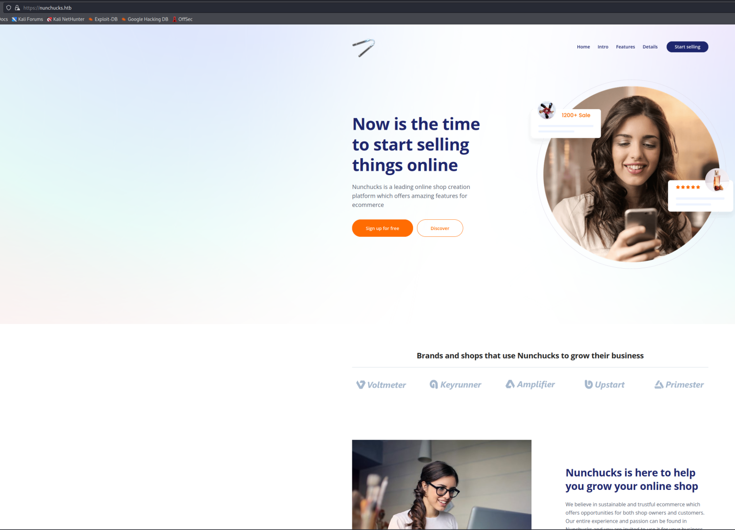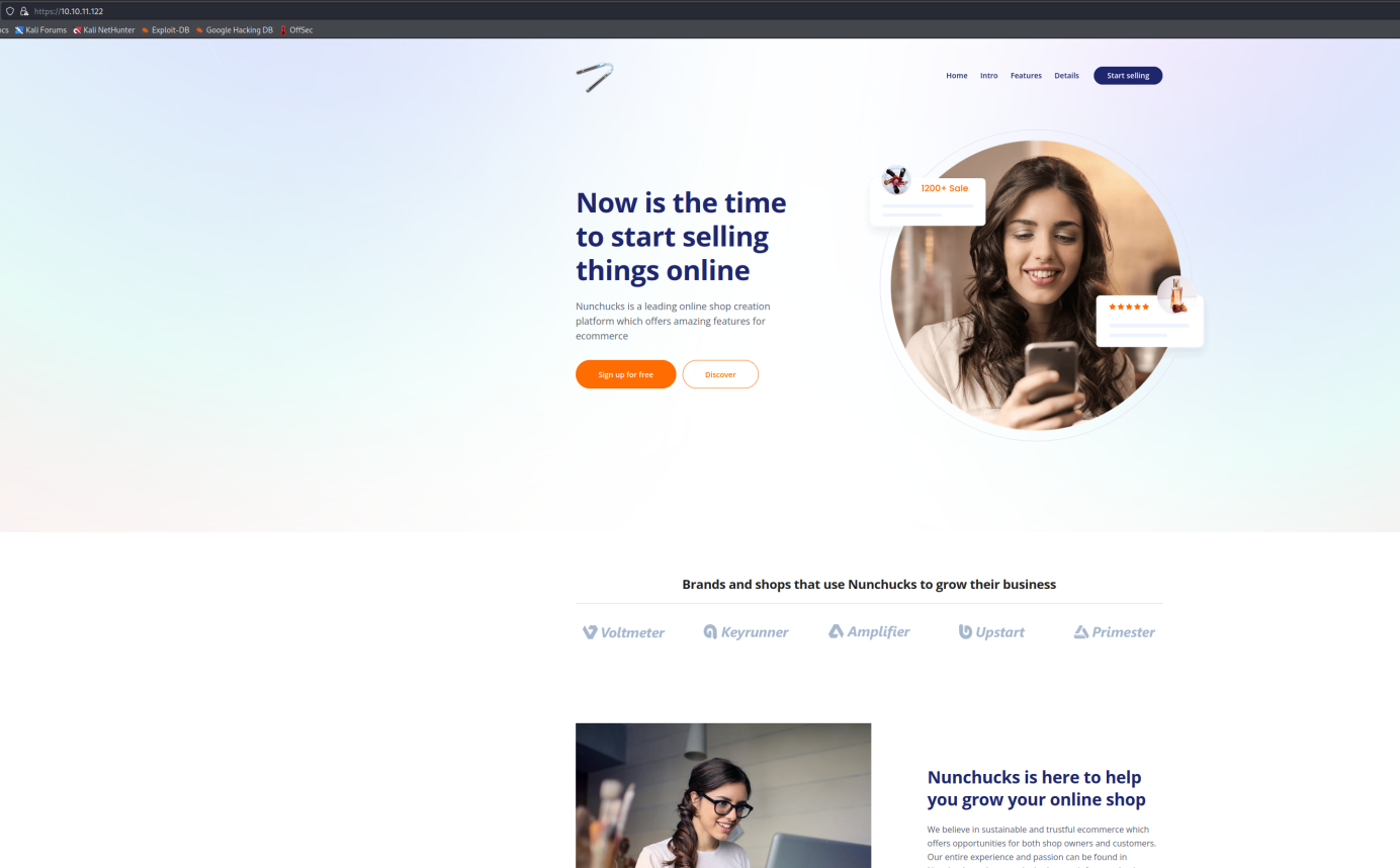 We have ports SSH TCP 22, HTTP TCP 80, and HTTPS TCP 443 to deal with. Navigating to http://10.10.11.122 is "Unable to Connect". Navigating to https://10.10.11.122 pulls up a sales page. Looking at the autorecon output for TCP 80, we see that there's a statement "Did not follow the redirect to http://nunchucks.htb. This means we need to add it to /etc/hosts using: