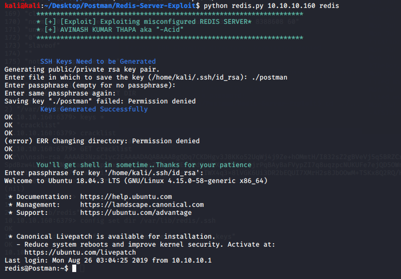 OK. It looks like this script is creating SSH keys and transferring them via redis-cli to the target. We could do that manually, but as I've said, hackers are lazy creatures. I'll re-use code/script as long as I understand what it is doing. That said, that script looks like it needs a valid username on the box, which we don't have. However, checking keys * in redis-cli and using GET cracklist, I can see the key that was created. Perhaps I can force the connection via key.
