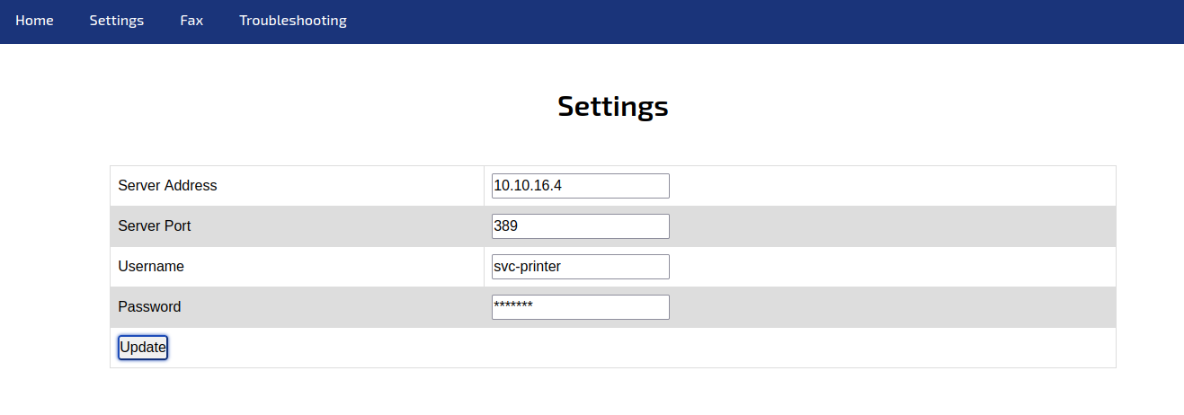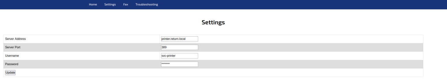 We have a lot of port here, but we're only going to need ports LDAP TCP 389 and HTTP TCP 80. Navigating to http://10.10.11.108 gives us a Printer Admin Portal. Going to Settings, we see a method of getting credentials back by changing the server to our TUN0 IP address.