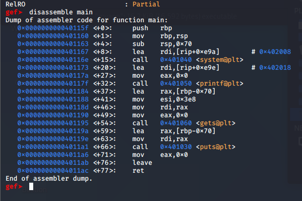OK. So we're dealing with an ELF that imports system() and gets() and of course main is primary drop in point with an additional test function. We can also see with checksec that No Execute is set. We need to bypass that. The only way that I know to bypass that is to use Return Object Programming (ROP) chains. We need to know what the buffer size is in the register so we can build our ROP chain. So, in gdb use disassemble main.