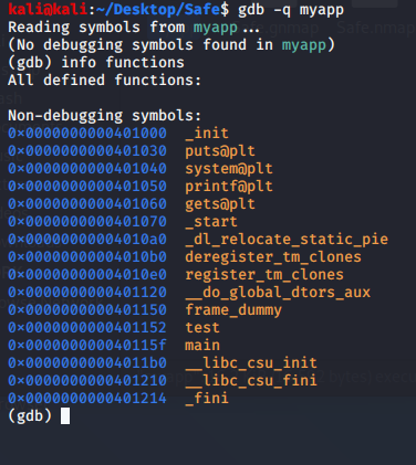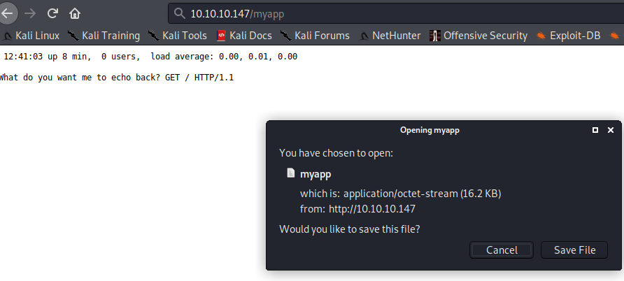Someone set a binary download and an "echo" page. Let's check out the binary first. Running file on it shows us that it is an ELF executable. That usually means reverse engineering or buffer overflow. Did I mention I suck and despise reverse engineering and buffer overflow? Really all things assembly? Let's see if GDB can do anything with it and list out the functions and any binary protections.