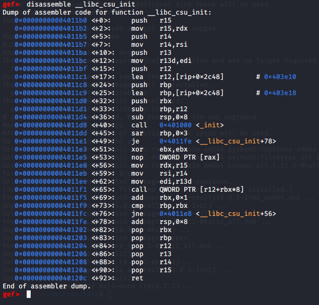 It looks like test() moves rdp to rdi and jumps to whatever address exists in r13. That means we should be able to set r13 as system() and use that to run system commands. To do that, we need to find the pop r13 call that moves the top of the stack into the right register. It took a minute to find (and I'm sure there are easier ways to do it and if you know any drop me a message) but I finally found pop r13 in the __libc_csu_init function at 0x0401206.