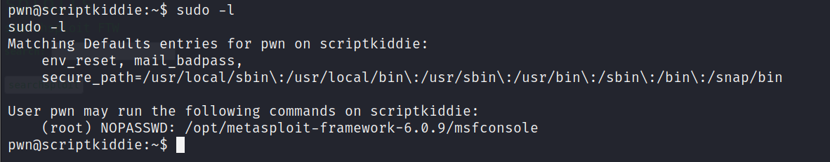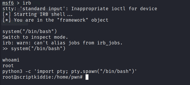 Metasploit has a built in Ruby shell using "irb" and then making system("") calls. That will only get us a shell as pwn again, though. Checking sudo privileges, we see that pwn can run msfconsole as root with no password.