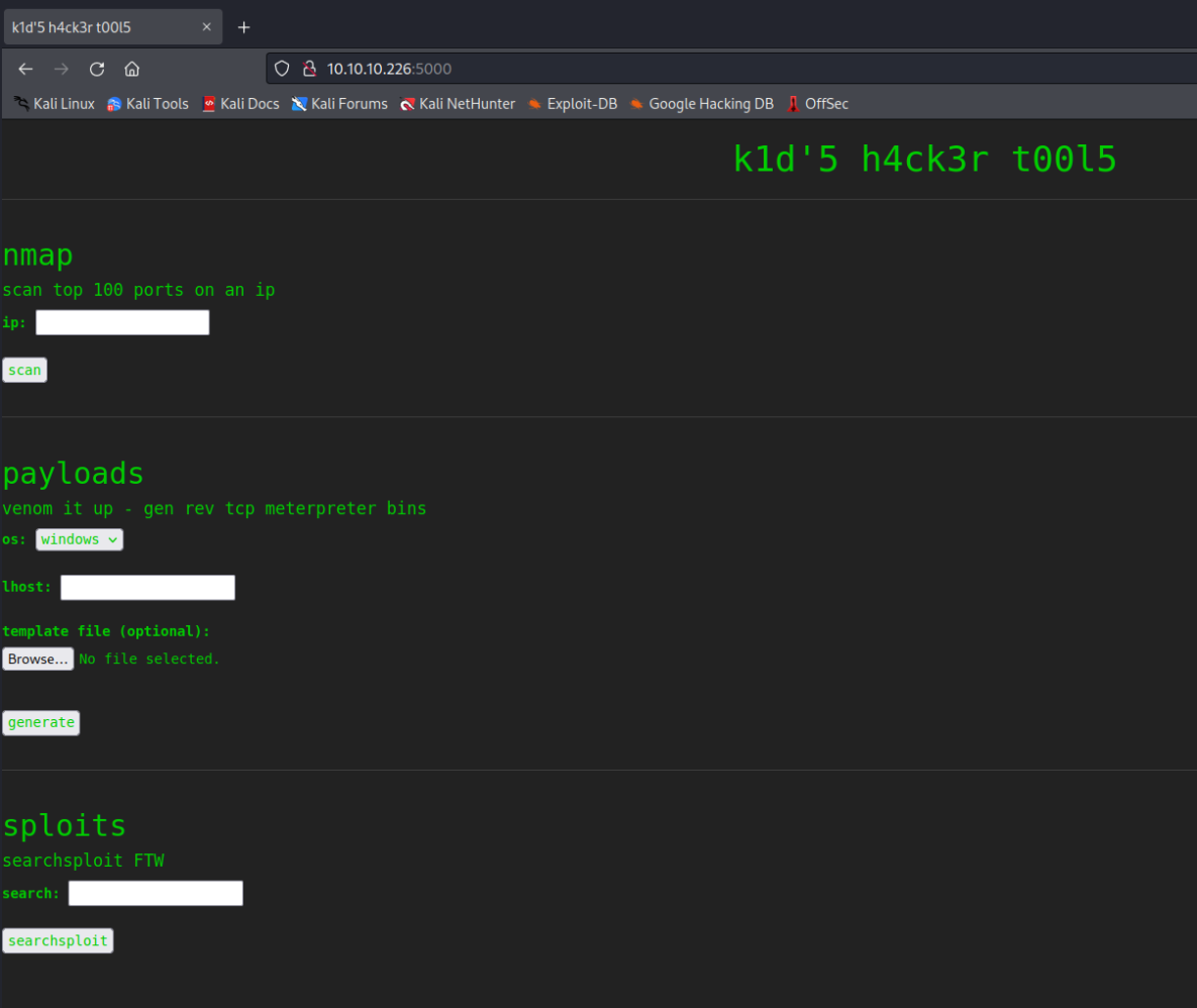 The main ports to worry about here are SSH TCP 22 and Werkzeug httpd server HTTP TCP 5000. Navigating to http://10.10.10.226:5000 gives us a "k1d'5 h4ck3r t00l5" page.