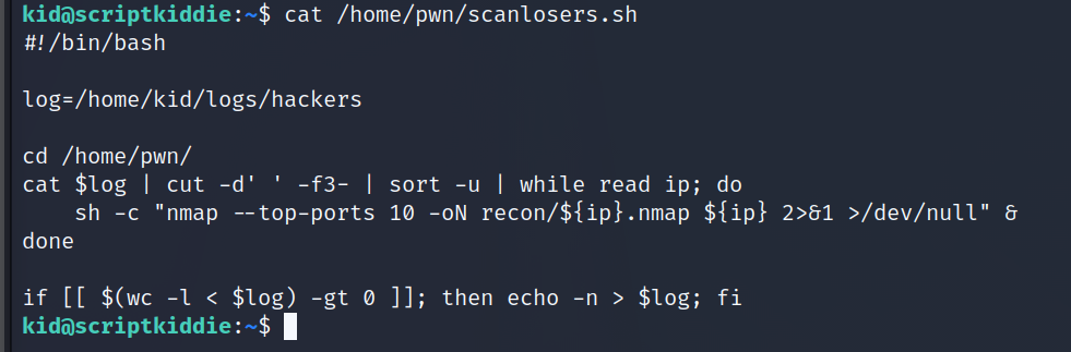 shows us there is a world readable script "scanlosers.sh". Let's see what it does.