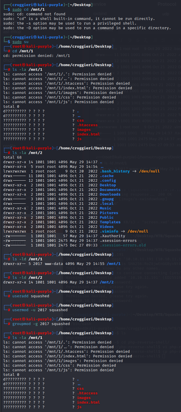 └─$ sudo mount -t nfs squashed.htb:/home/ross /mnt/2