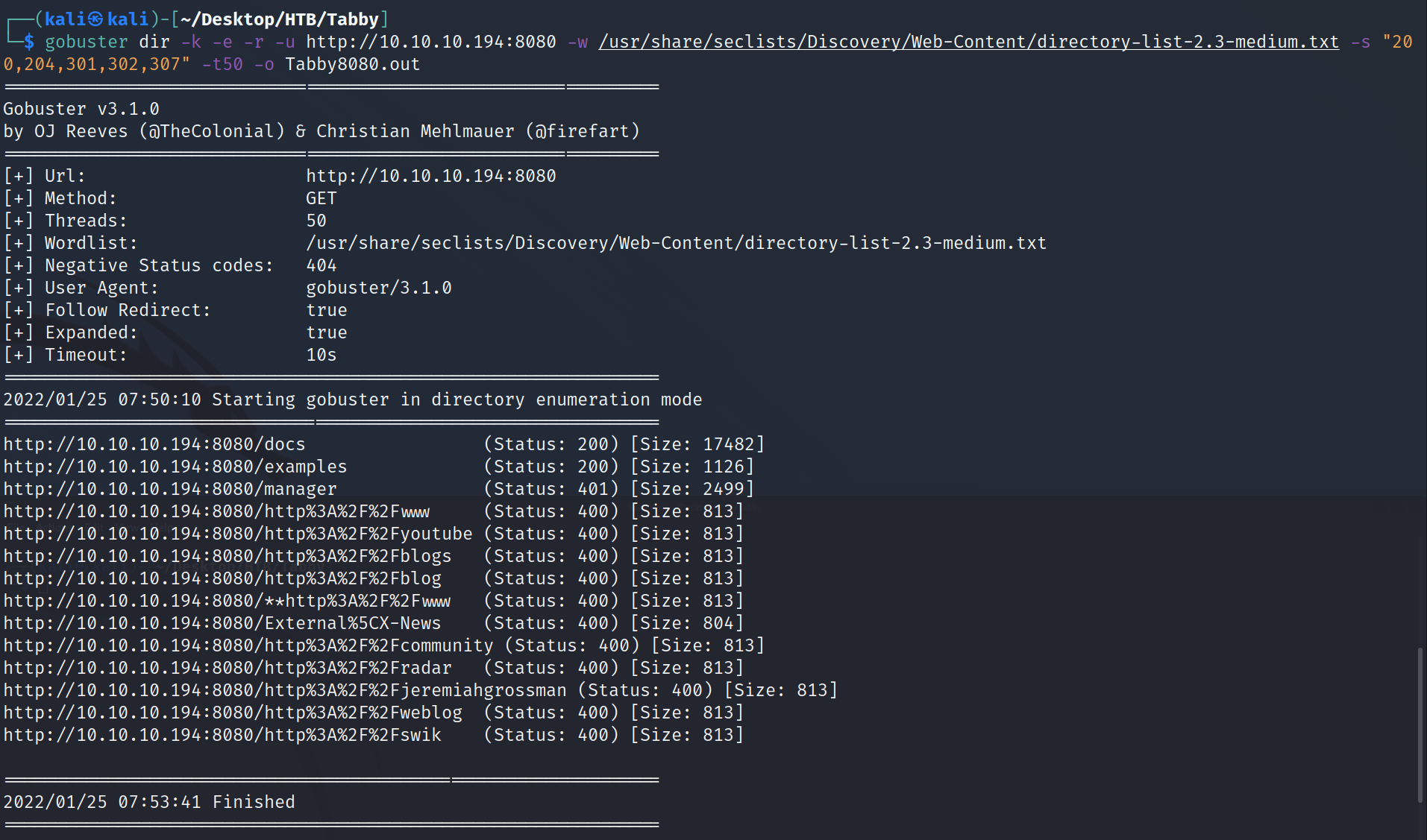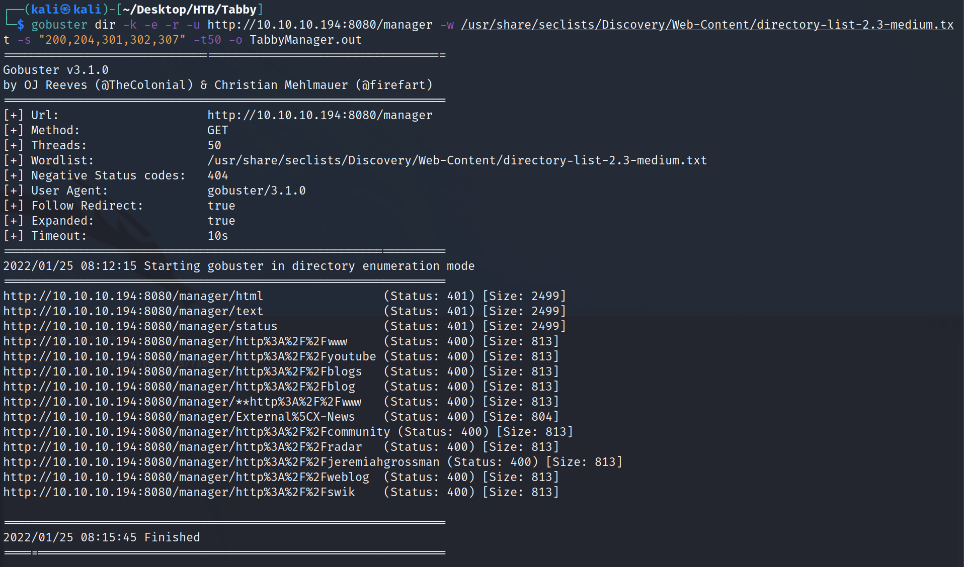 gobuster dir -k -e -r -u http://10.10.10.194:8080/manager -w /usr/share/seclists/Discovery/Web-Content/directory-list-2.3-medium.txt -s "200,204,301,302,307" -t50 -o TabbyManager.out