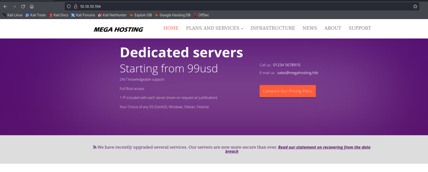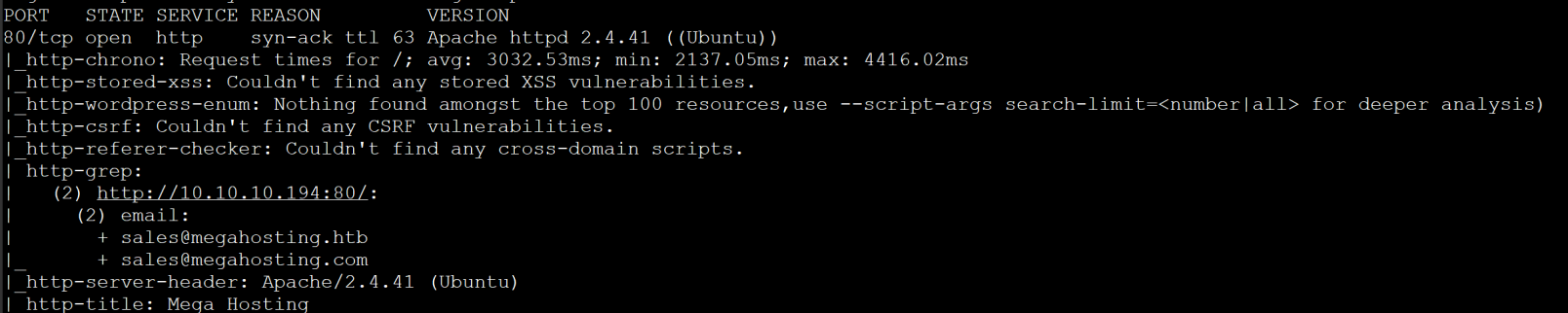 Three open ports to play with, SSH TCP 22 and HTTP on TCP 80 and TCP 8080. Looking at the banner that is grabbed during the autorecon scan, we see the page's hostname is "megahosting.htb" so we need to add that to our /etc/hosts file.