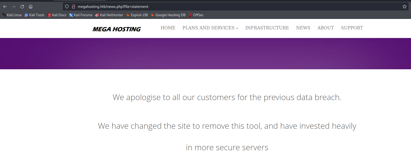 Now we can navigate to all the different links. We find a very interesting variable similar to many of the ?cmd= points at /news.php?file=statement. Many times, this item is an inclusion point. An entry using Local File Inclusion (LFI) attacks. We can test this by adding a series of "../" and add /etc/passwd to the end of it. The number of ../ determines how far down the directory tree you are or you just add a large number of ../ and include pretty much and file on the box.