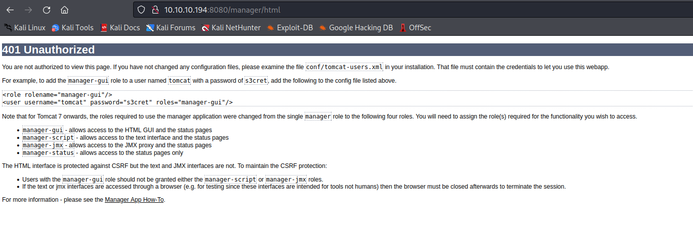 We still can't log into the manager page because the manager-gui role is not assigned. We'll need to do this via Command Line Interface (CLI). More difficult, but not too bad. We'll need to adjust our Gobuster to check what's behind that manager page.