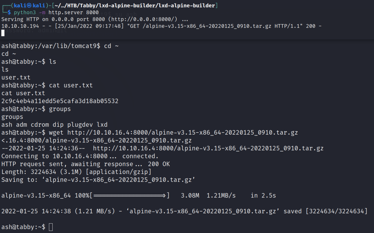 This will create an alpine tar.gz image (in this case alpine-v3.15-x86_64-20220125_0910.tar.gz) and we can start a python webserver to move it to ash's home folder.
