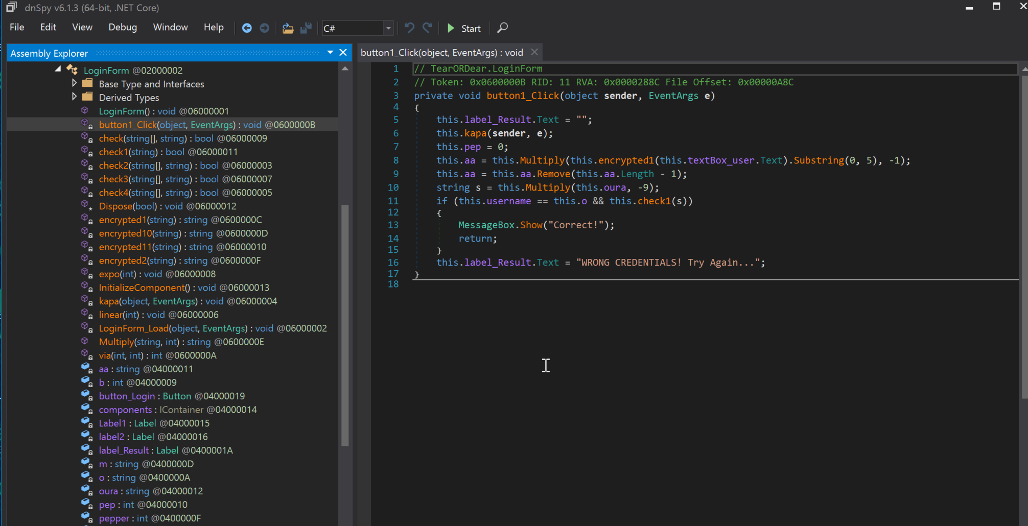 Let's do this one strictly in Windows using DNSpy. Always good to have a broad knowledge of the different tools. On cursory glance, it looks like the "button1_Click" function compares this.o and this.check1 one to ensure the credentials are correct and it is a strict check. That means this.o and this.check1 are going to be in memory for the check.