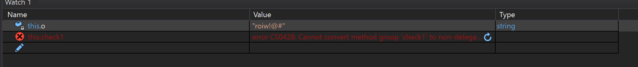 Let's set a breakpoint at that if function and check the memory. Now, some of you might have noticed that I stupidly tried to debug this in DNSpy x64 not x86. I fixed that now XD I set the breakpoint, run the program, and enter a for the userename and b for the password. Now when we add a watch to this.o and this.check1 we notice that this.check1 cannot be "watched," but that this.o's value is "roiw!@#" Why can't we watch this.check1? Because it is function logic and not really a variable. Let's follow the check1 logic path.