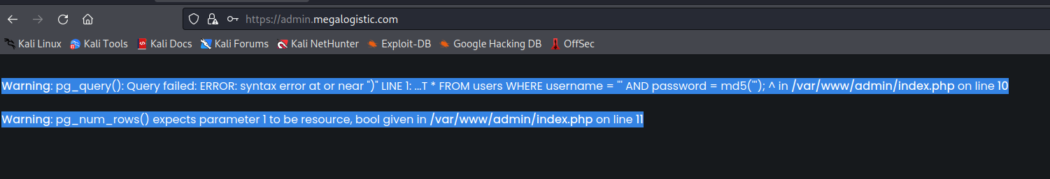 This login is absolutely vulnerable to SQLi Authentication Bypass. After trying several different ones for PostGRESQL (we can tell it is used by the pg_query and pg_num_rows portions of the error) from PayloadAllTheThings, we finally find the right combination.
