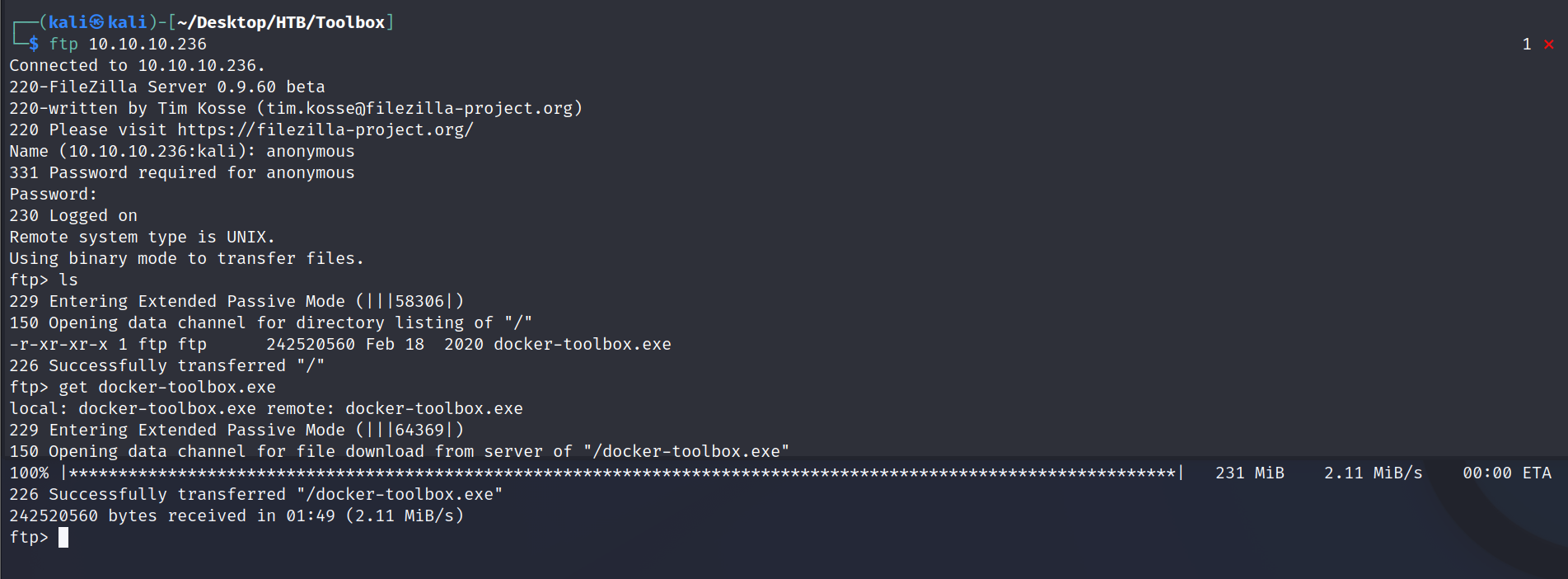 We have added all the autorecon outputs to the Pentest Workshop PDF. Looking at the FTP TCP 21 output, we see that anonymous access is allowed. When we FTP to the target, we see a docker-toolbox.exe that we can GET.